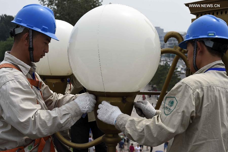 Workers clean and overhaul a lamp during the annual maintenance of city lamps near Tian'anmen Square, in Beijing, capital of China, July 6, 2015. (Xinhua/Gong Lei)