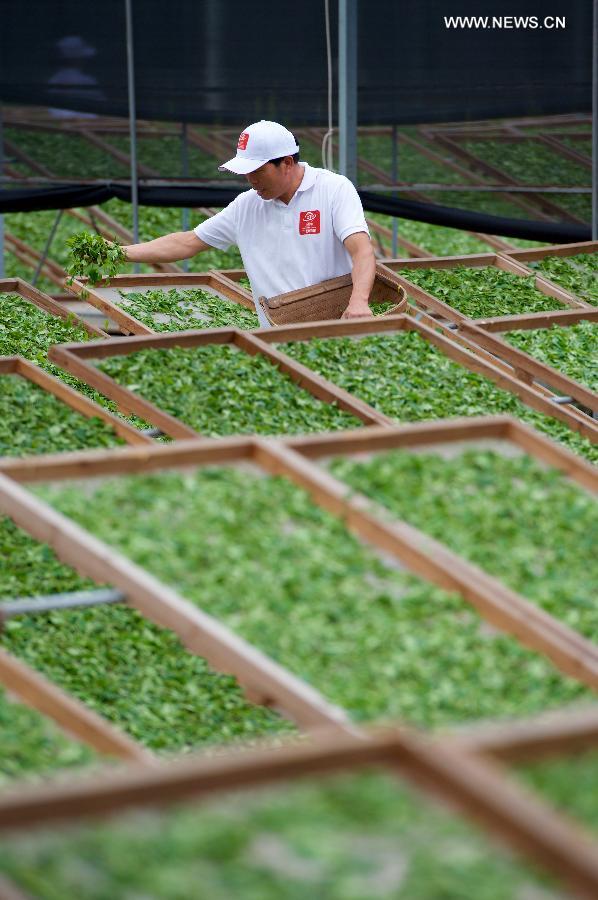 Tea leaves drying at white tea garden in SE China's Fujian (3)