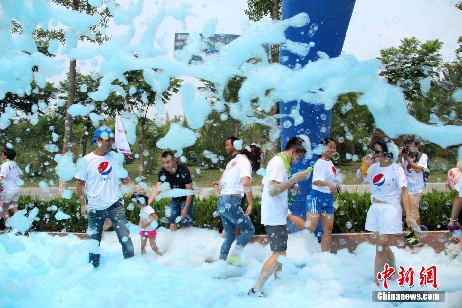 A sudsy runway welcomed more than 4,000 joggers to Xi’an over the weekend. The Bubble Run, originated in the U.S is regarded as the “the most fun 5k run in the world”. (CNS/ Zhang Yichen)