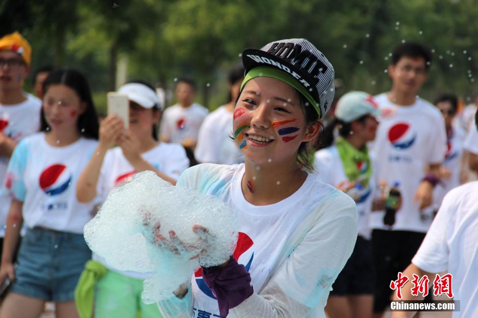 A sudsy runway welcomed more than 4,000 joggers to Xi’an over the weekend. The Bubble Run, originated in the U.S is regarded as the “the most fun 5k run in the world”. (CNS/ Zhang Yichen)