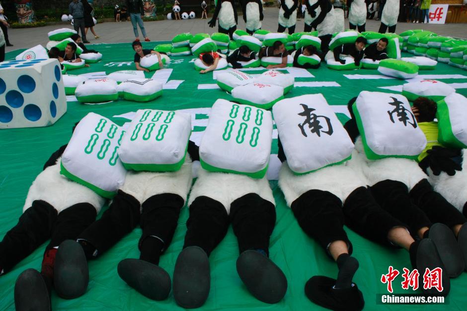 | A funny "giant panda" mahjong contest is held in Jiuzhaigou scenic area, Aba Tibetan and Qiang Autonomous Prefecture, southwest China's Sichuan Province, July 5, 2015. The game was played by four "giant panda" mahjong enthusiasts and 136 "giant panda tiles" on a 100 square meter mahjong "table". (CNS/Wei Wei) |