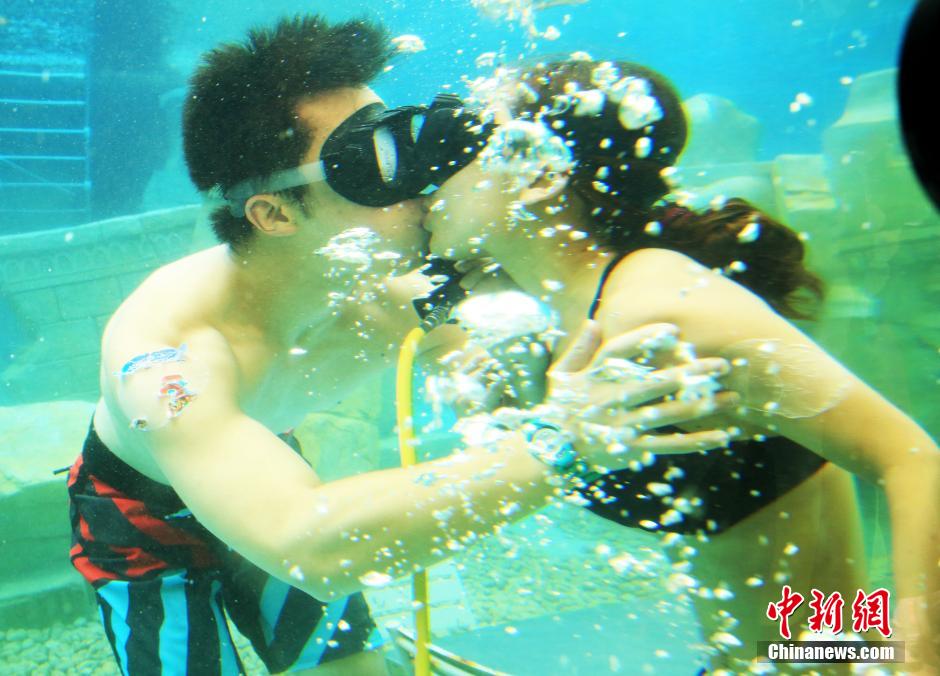 An underwater kissing contest is held in Maya Beach Water Park in Shanghai on July 5, 2015. 20 pairs of lovers in swimming suits competed in the contest. Xu Jun and Zhang Wenqing from Shanghai won the championship with 1 minute and 20 seconds.