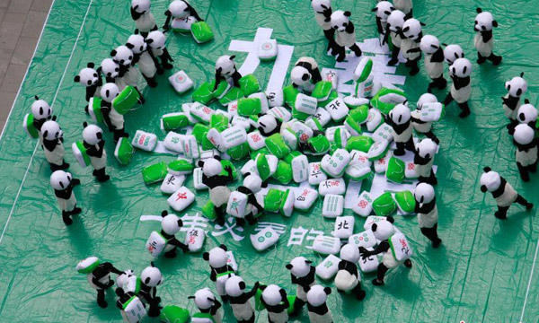 A funny "giant panda" mahjong contest is held in Jiuzhaigou scenic area, Aba Tibetan and Qiang Autonomous Prefecture, southwest China's Sichuan Province, July 5, 2015. The game was played by four "giant panda" mahjong enthusiasts and 136 "giant panda tiles" on a 100 square meter mahjong "table".