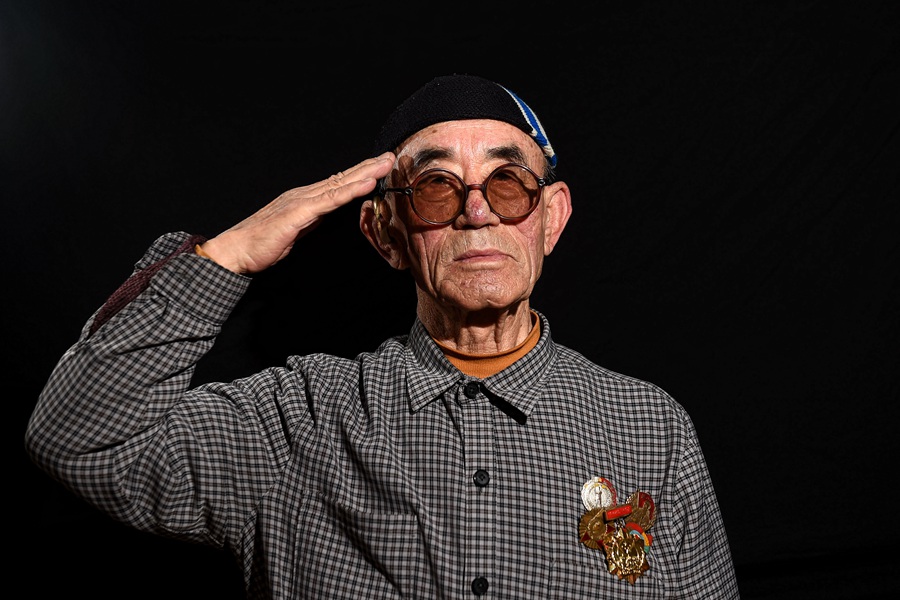 Tian Tuihua, 86, whose father were tortured to death by Japanese soldiers joined in the Chinese army in 1944. He killed four Japanese invaders during the battle. On occasion of the 70th anniversary of the victory of the War of Chinese People's Resistance against Japanese Aggression, a Xinhua reporter takes photos of nine veterans’ salutes in Chengde, north China’s Hebei province. (Photo/Xinhua)