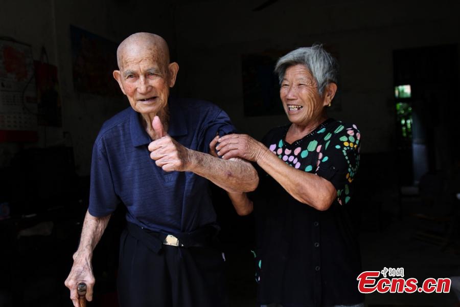 Lu Kejing, 92, and his wife Tang Qiuzhi, 83, pose for a photo in Daoxian county, Central China’s Hunan province. Lu fought against Japanese troops in India in 1942 and also served during the Korean War. He returned to his hometown in 1954, married his wife, and the couple now has two sons and one daughter. (Photo: China News Service/He Hongfu)