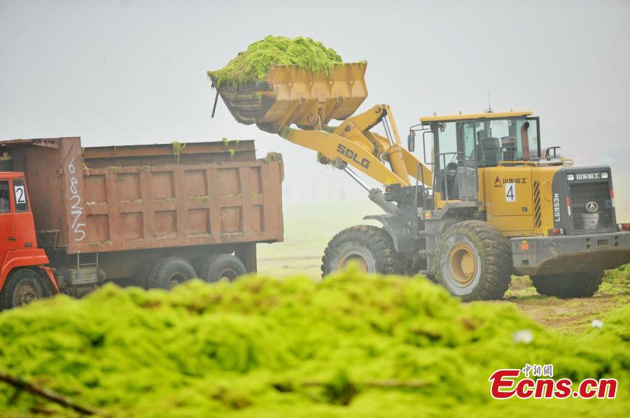 Forklifts and trucks are used to clear algae bloom piling on a beach in Qingdao city, East China’s Shandong province, July 6, 2015. The coastal city, a tourist destination in summer, is facing an invasion from algae bloom due to tides and winds. (Photo: China News Service/Wang Haibin)