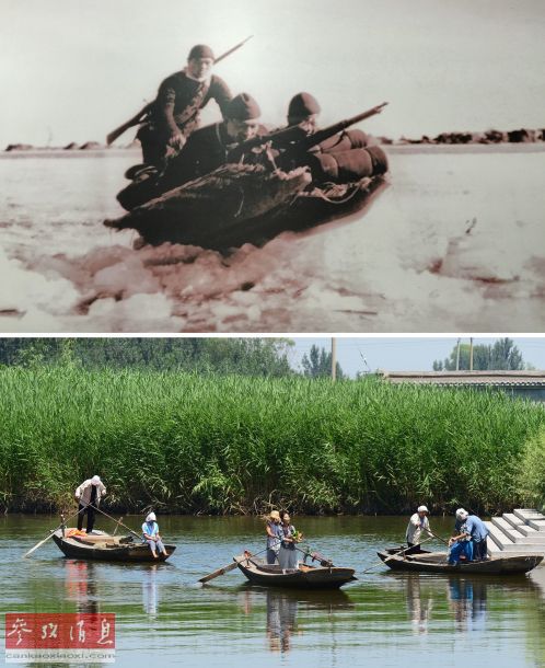 Above: The soldiers of Yanling Team train on the ice of the Baiyangdian Lake in winter. (File photo) Below: A performance is given in the Baiyangdian Lake in Hebei province. (Imposition photo) (Xinhua/Zhu Xudong)