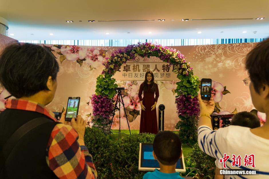 "Yang Yang", a humanoid robot with a variety of realistic expressions, appears in Shanghai on July 7, 2015. Yang, with smooth and delicate human-like skin, can"talk, shake hands and sing. She made debuts at the World Internet Conference in Beijing in May.(CNS Photo)