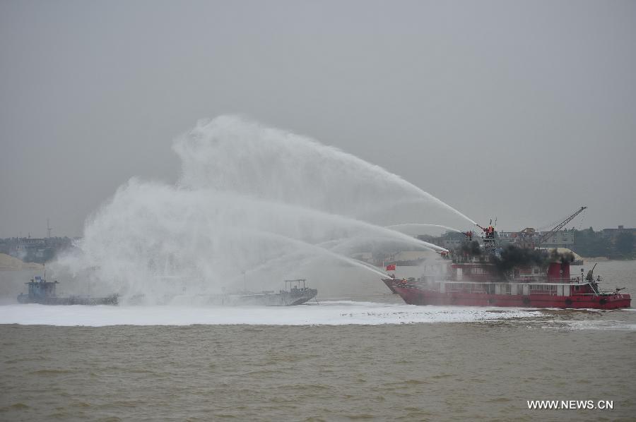 A water rescue drill is held on the Ganjiang River in Nanchang, capital of east China's Jiangxi Province, July 8, 2015. Some 300 people and 33 vessels as well as drones and rescue vehicles were involved in the drill here on Wednesday. (Xinhua/Zhou Mi)
