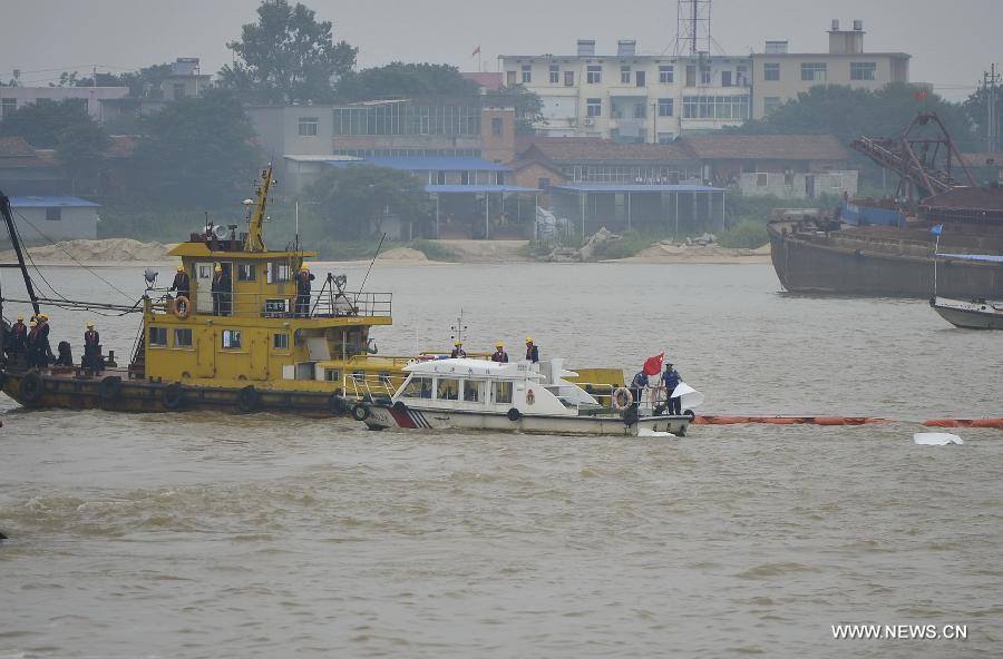A water rescue drill is held on the Ganjiang River in Nanchang, capital of east China's Jiangxi Province, July 8, 2015. Some 300 people and 33 vessels as well as drones and rescue vehicles were involved in the drill here on Wednesday. (Xinhua/Zhou Mi)