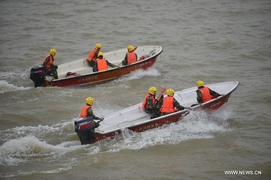 A water rescue drill is held on the Ganjiang River in Nanchang, capital of east China's Jiangxi Province, July 8, 2015. Some 300 people and 33 vessels as well as drones and rescue vehicles were involved in the drill here on Wednesday. (Xinhua/Zhou Mi)