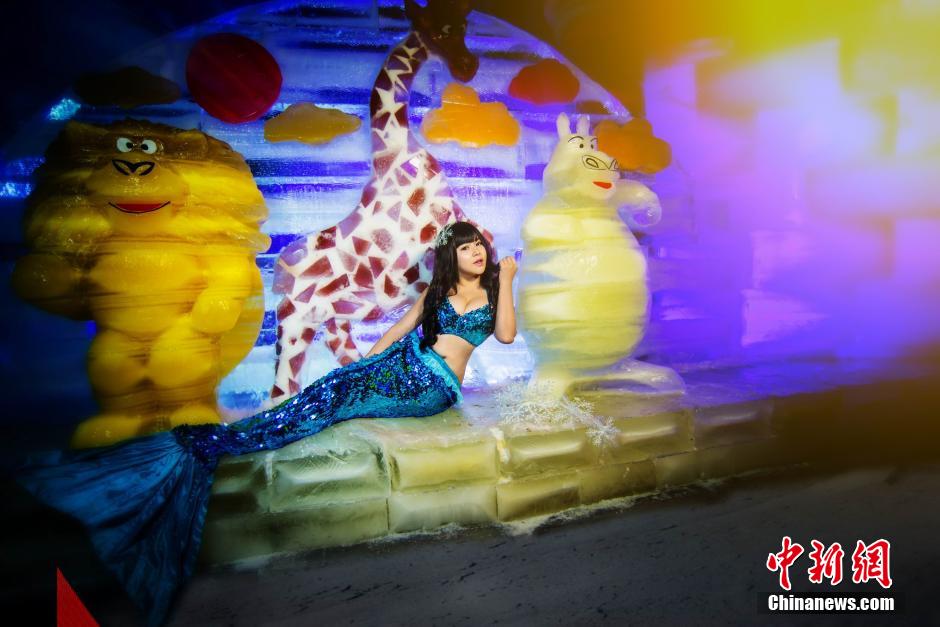 At the snow carnival being held at the scenic spot of Longhu Mountain, southeastern China's Jiangxi province, a sexy girl wears blue mermaid costume to attract visitors despite the temperature of minus 10 degrees Celsius. (CNS Photo)