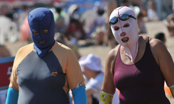 Dozens of dama wear face-kinis on the beach in Qingdao, east China's Shandong Province, July 8, 2015. In Chinese, dama refers to middle-aged women. The face masks help protect their face from the sun.