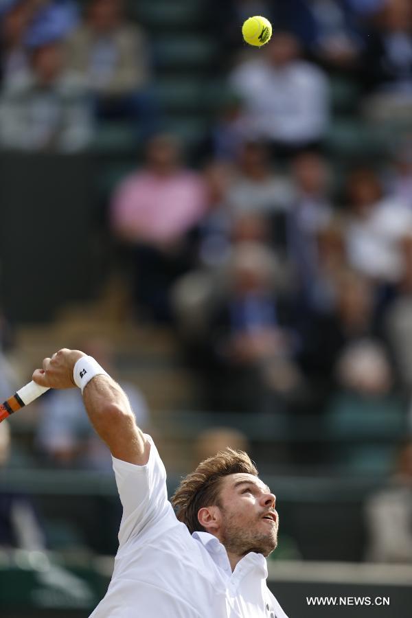 Stan Wawrinka of Switzerland servess a ball during men's quarterfinal match against Richard Gasquet of France at the 2015 Wimbledon Championships in Wimbledon, southwest London, July 8, 2015. Gasquet won the game 6-4, 4-6, 3-6, 6-4 and 11-9. (Xinhua/Ye Pingfan)