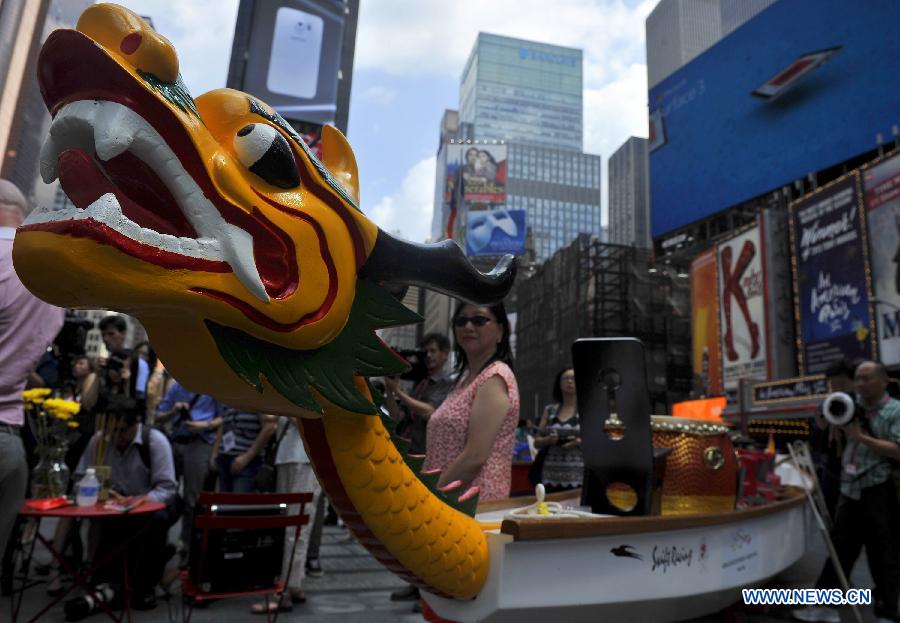 People attend the dragon boat awakening ceremony at Times Square in New York, the United States on July 7, 2015. A dragon boat awakening ceremony is held at Times Square for 25th anniversary Hong Kong dragon boat festival here on Monday. The 25th annual Hong Kong Dragon Boat Festival in New York will be held on Aug. 8 and Aug. 9. (Xinhua/Wang Lei)