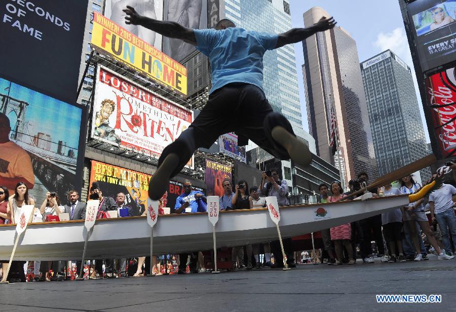 People attend the dragon boat awakening ceremony at Times Square in New York, the United States on July 7, 2015. A dragon boat awakening ceremony is held at Times Square for 25th anniversary Hong Kong dragon boat festival here on Monday. The 25th annual Hong Kong Dragon Boat Festival in New York will be held on Aug. 8 and Aug. 9. (Xinhua/Wang Lei)