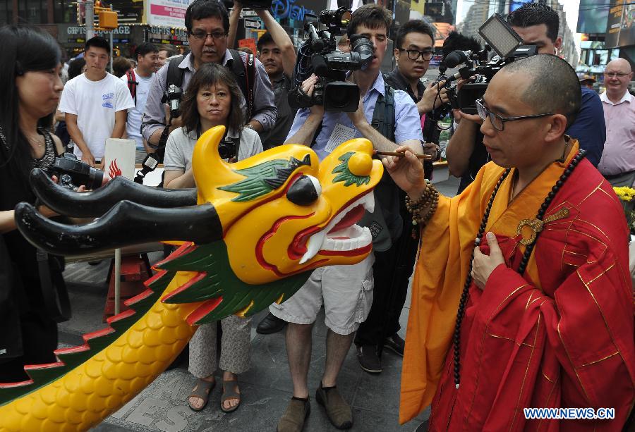 A monk dots the eyes for a dragon during the dragon boat awakening ceremony at Times Square in New York, the United States on July 7, 2015. A dragon boat awakening ceremony is held at Times Square for 25th anniversary Hong Kong dragon boat festival here on Monday. The 25th annual Hong Kong Dragon Boat Festival in New York will be held on Aug. 8 and Aug. 9. (Xinhua/Wang Lei)