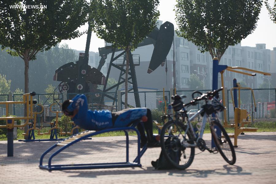 A man exercises near an oil pump in Daqing, northeast China's Heilongjiang Province, July 7, 2015. Daqing oilfield was discovered in 1959, which is the largest inland oilfield in China. On the 4,300 square kilometers oilfield, there are some 50,000 oil wells. (Xinhua/Jin Liwang)