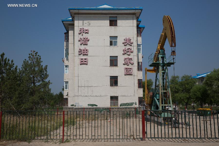 Photo taken on July 8, 2015 shows an oil pump in a residential community in Daqing, northeast China's Heilongjiang Province. Daqing oilfield was discovered in 1959, which is the largest inland oilfield in China. On the 4,300 square kilometers oilfield, there are some 50,000 oil wells. (Xinhua/Jin Liwang)