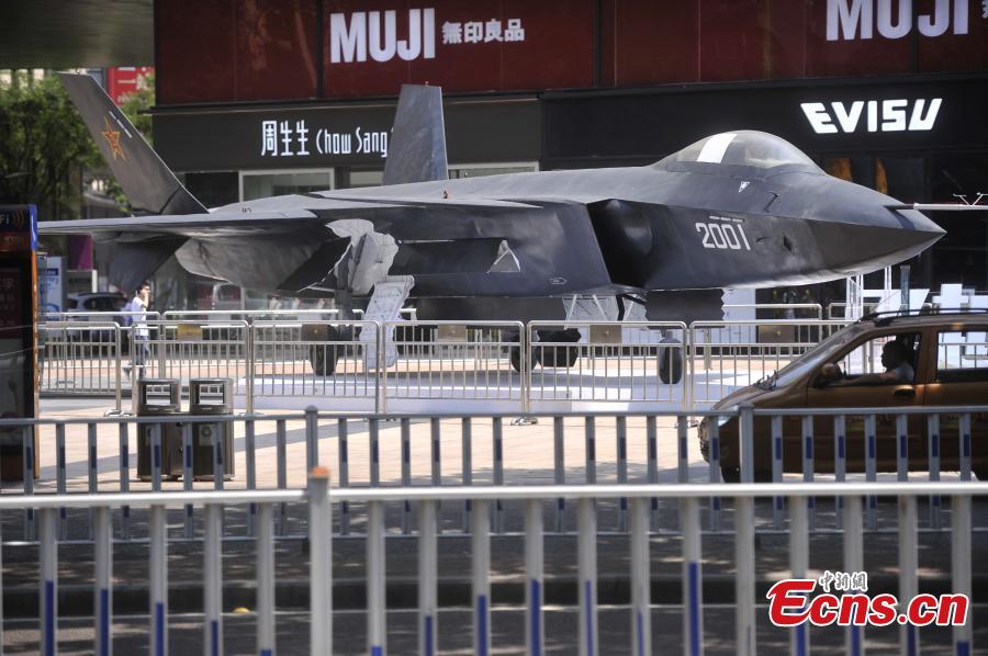 A replica of China’s J-20 stealth fighter is on display in a square in Southwest China’s Chongqing municipality, July 8, 2015. The life size alloy model is 4.5 meters tall, 21.26 meters long, and has a wingspan of 12.88 meters. (Photo: China News Service/Chen Chao)