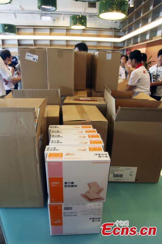 Medical supplies donated by the mainland’s Red Cross Society arrive in Taipei, Taiwan, July 8, 2015. The supplies will be distributed to 13 hospitals where people injured by a blaze at a water park party are receiving treatment. (Photo: China News Service/Huang Shaohua)
