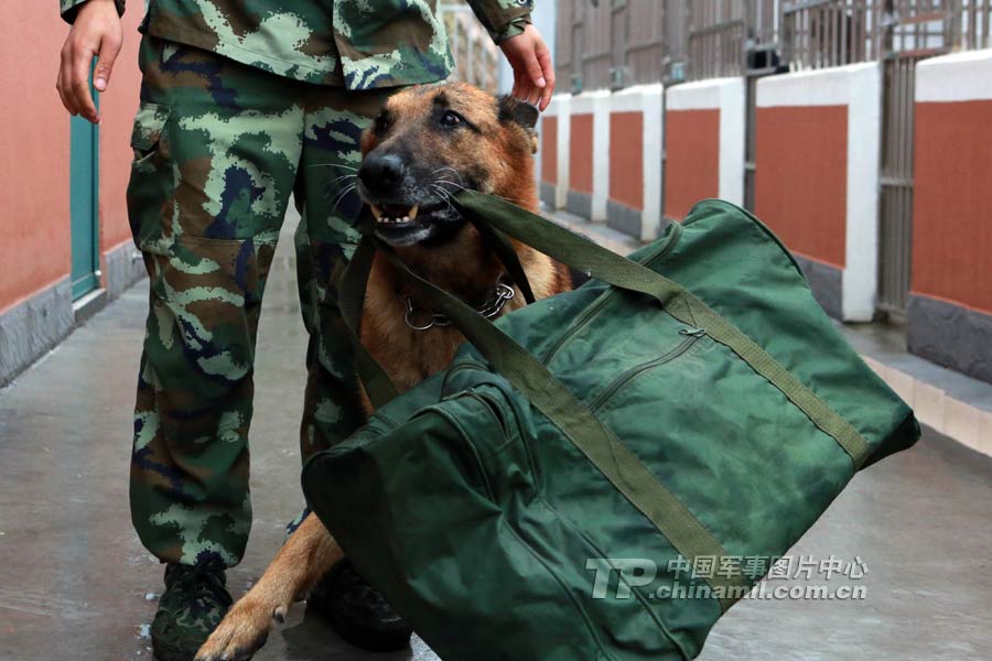 A military dog helps a solider carry the bag. (Photo/TP.chinamil.com.cn)