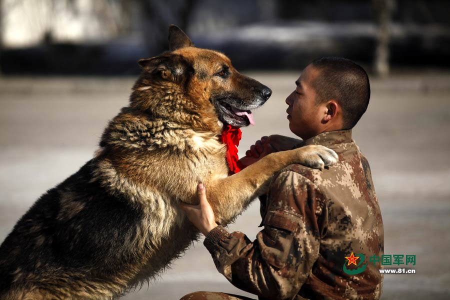 A military dog to be retired and a solider hug each other. (Photo/81.cn)