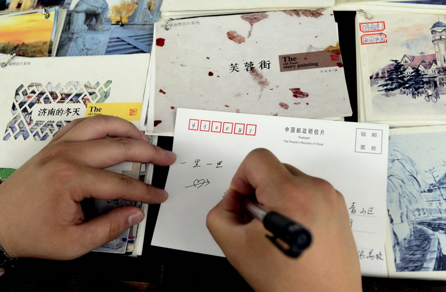 A customer writes on the postcards, July 8, 2015. (Xinhua/Zhao Xiaoming)