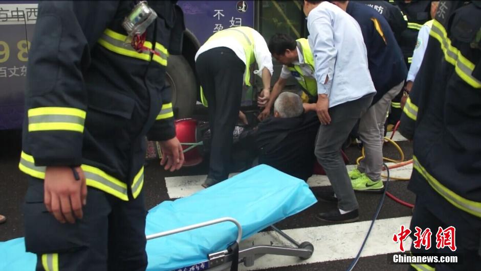 An old man and his motorcycle were pinned under a bus after a collision in Ningbo, eastern China's Zhejiang province on July 8. The old man was saved by the fire fighters after the passersby lifted the vehicle up. (CNS Photo)