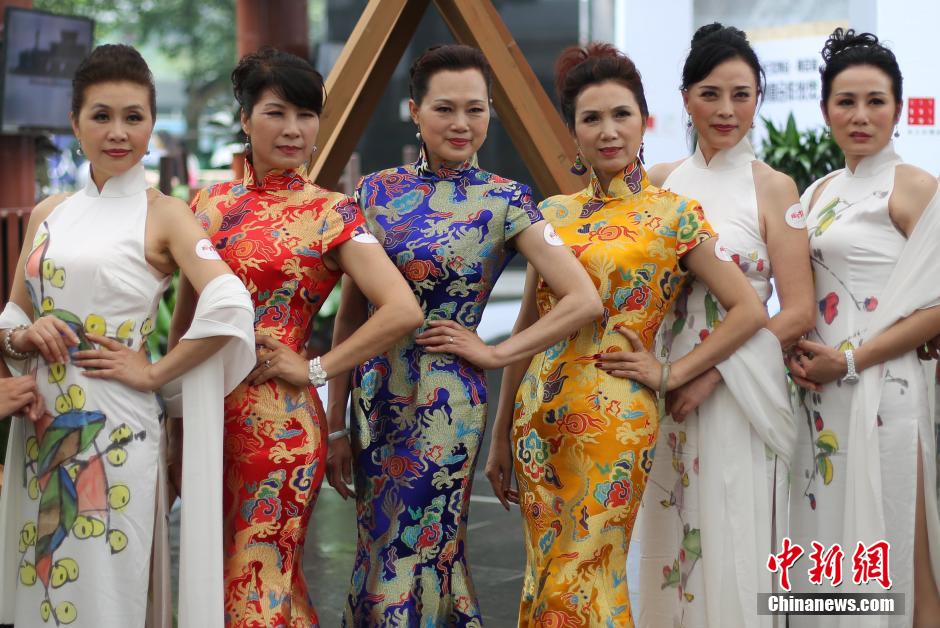 A model team composed of middle-aged women in cheongsams performs in the show with the theme of “Nanjing Week at the Expo Milano”