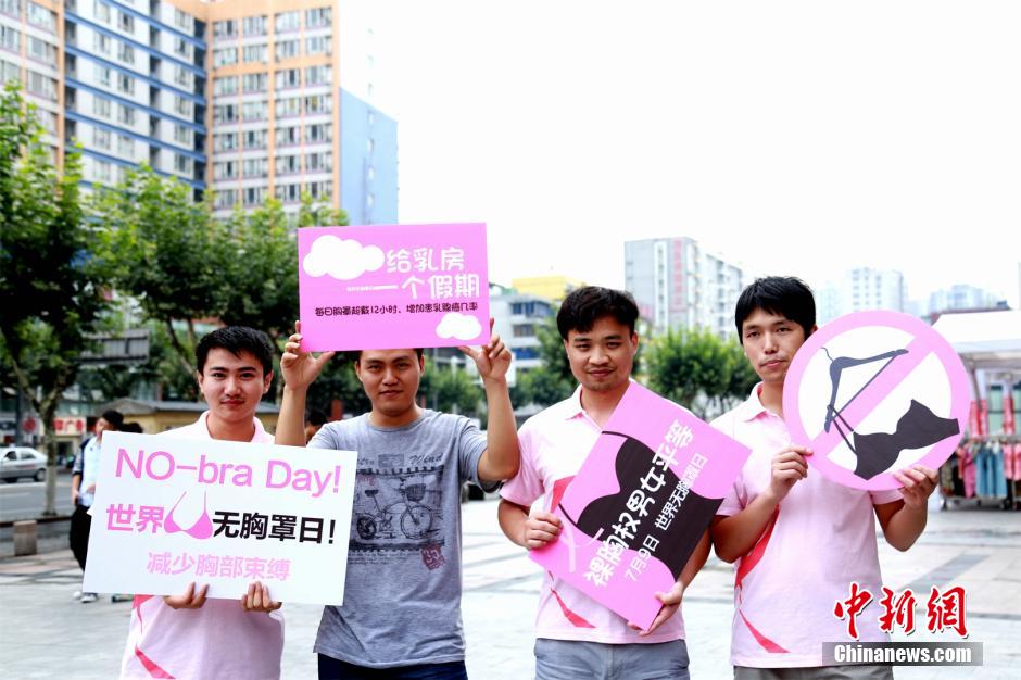 To mark the No Bra Day, volunteers call the public to pay attention to the breast health in Chengdu, southwest China's Sichuan province on July 9, 2015. Research indicates that wearing bra may increase the risks of getting breast cancer for a woman. (CNS/Liu Yanjun)