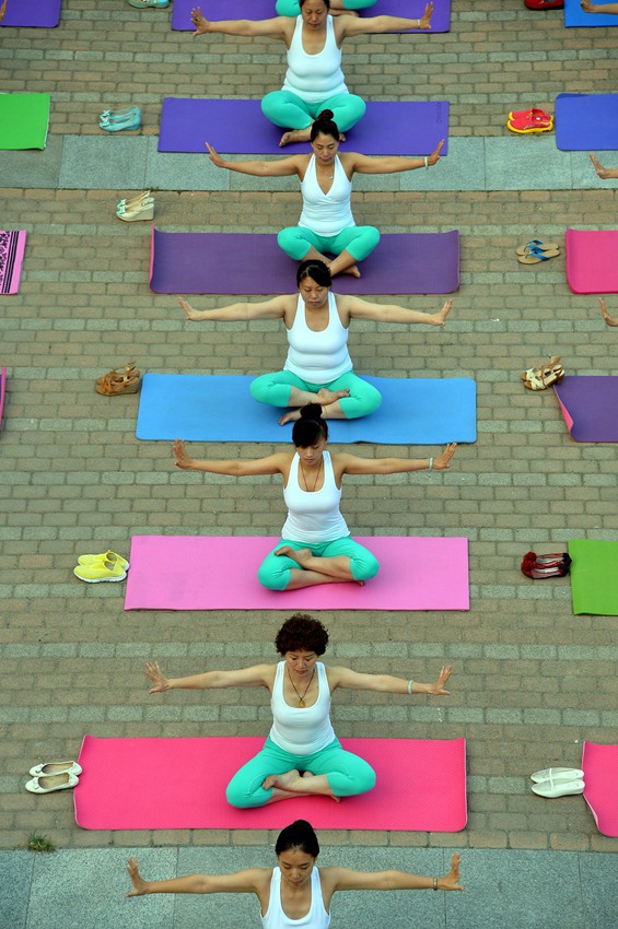 Enthusiasts practice yoga together in a scenic spot in Dezhou, Shandong province on July 8, 2015. Most of the participants are women from 10 to 60 years of age. (Xinhua/ Fang Changguo)