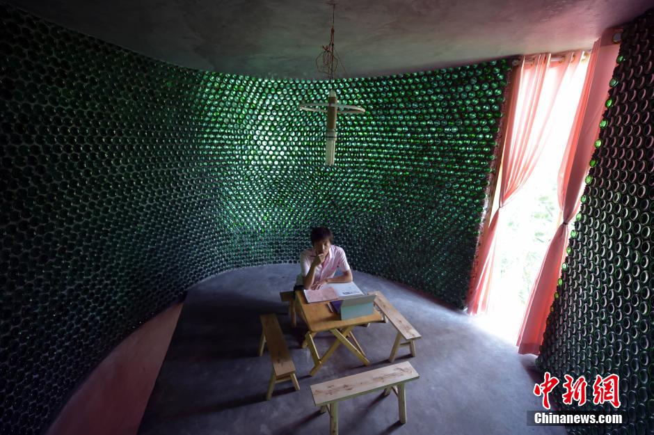 When everyone is busy with their job finding or preparation for graduate school, senior student Li Rongjun is working on his own business - a cabin made of 8,500 beer bottles. The cabin has two floors, and the upper floor is composed of green beer bottles. His neighbors came to visit the beer bottle cabin, and were all amazed by the spectacular feeling of staying inside this cabin. But Li still has a long way to go before his little "business" starts running. Besides innovation, cooperation with companies with professional promotional skills to make the cabin more appealing to the market is key to his success.(Chinanews/Zeng Wei)
