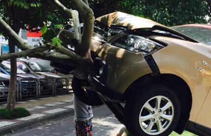 | A greedhand driver drives his new car up a tree outside a 4S shop where he has just brought the car in Nanjing, east China’s Jiangsu province on July 12, 2015. The driver got his driving license a month ago. Fortunately, nobody was hurt. (Photo from Weibo) |
