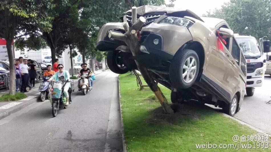 A greedhand driver drives his new car up a tree outside a 4S shop where he has just brought the car in Nanjing, east China’s Jiangsu province on July 12, 2015. The driver got his driving license a month ago. Fortunately, nobody was hurt. (Photo from Weibo)