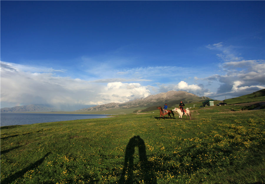 People ride horses near Sayram Lake in Northwest China's Xinjiang Uygur autonomous region in June, 2015. Sayram means "blessing" in Kazak. Renowned as a "pearl" on the mountain, the lake is the largest and highest alpine lake in the region's Bortala Mongol autonomous prefecture. It lies at a height of 2,073 meters above sea level. [Photo by Du Wei/For chinadaily.com.cn]