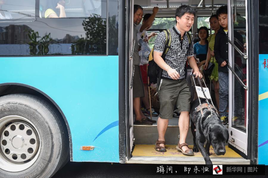Mixiu leads Wu Lei off the bus, July 10, 2015. (Xinhua/Ou Dongqu)