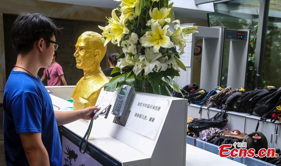 A statue of the late Apple cofounder Steve Jobs is seen at a technology company in Shanghai. The company put the gold-plated statue at the entrance to inspire its employees to learn from the former Apple CEO. (Photo: China News Service/Yu Qing)