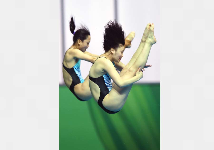 | Wang Han, front, and Wang Yin compete in women's 10-meter synchronized diving, July 6, 2015. They won the bronze medal by finishing third. [Photo/Xinhua] |