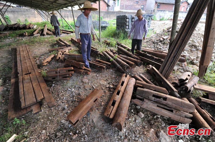 Workers reassemble a historic house donated by Hong Kong action film superstar Jackie Chan in Changting county, East China’s Fujian province, July 14, 2015.