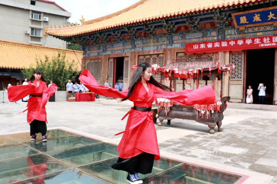 High school students in Hanfu clothing perform in a talent show in Confucian Temple on July 12, 2015 in Jinan, Shandong province.