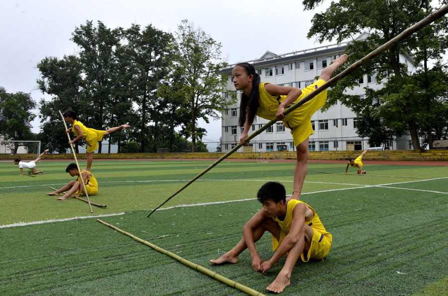 Middle school students practice single bamboo drifting in Rongjiang county, southwest China's Guizhou province on July 12, 2015. Single bamboo drifting is a national traditional sport. The rower positioned on a single bamboo makes different actions when drifting. In recent years, Rongjiang county has begun to promote this traditional sport in schools.
