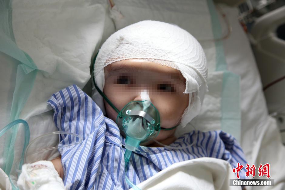 | After 17 hours of effort, doctors successfully completed a skull transplant surgery on three-year-old Hanhan, who is called the big-head baby, in the Second People's Hospital of central China's Hunan province on July 15, 2015. The girls' new skull was printed by 3D printers. This is also the world's first case of such surgery.(CNS Photo) |