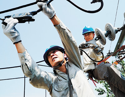 Workers of State Grid Corporation of China repair the circuit under high temperature