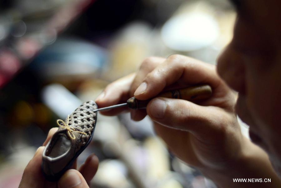 Peng Shizeng, a 55-year-old shoe designer, works on a mini shoe at a cultural and creative park in Jinan, capital of east China's Shandong Province, July 16, 2015. Peng started making the mini shoes since 2013, aiming at to attract more attention on this art. (Xinhua/Zhao Xiaoming)
