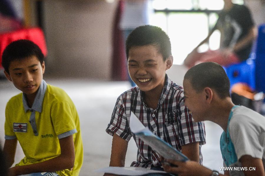 A boy participates in a game in Xinyuan Village under Meishan Town of Changxing County, east China's Zhejiang Province, July 16, 2015. Summer programs including academic tutoring, group activities and arts training were held for left-behind children of migrant workers in the county. (Xinhua/Xu Yu)