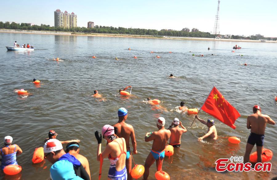 Participants from China swim across the Heilong River in Heihe city, Northeast China’s Heilongjiang province, July 16, 2015. About 230 people from China and Russia attended the activity, the 13th of its kind, held in Heihe and the city of Bulageweishensike, Russia to swim across the border river. (Photo: China News Service/Liu Liming)