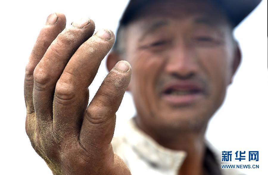 | A famer shows his hand, turned yellow by the polluted water of the Duliujian River in Tianjin municipality, July 11, 2015. The river, which runs for 67 kilometers, is a major flood diversion project that runs through several regions in Tianjin, and it provides water for the Beidagang Wetland, a significant habitant for migratory birds in East Asia. Companies based along the river's banks have been polluting its waters for ten years. Residents living near the river complain about the bad smell, diminished harvests, and suspicious deaths of poultry. (Photo/Xinhua) |