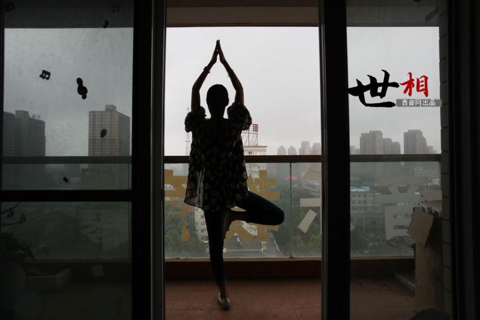 Zhang Wenjin practices yoga in her music training center. (cnwest.com/Wei Yongxian)
