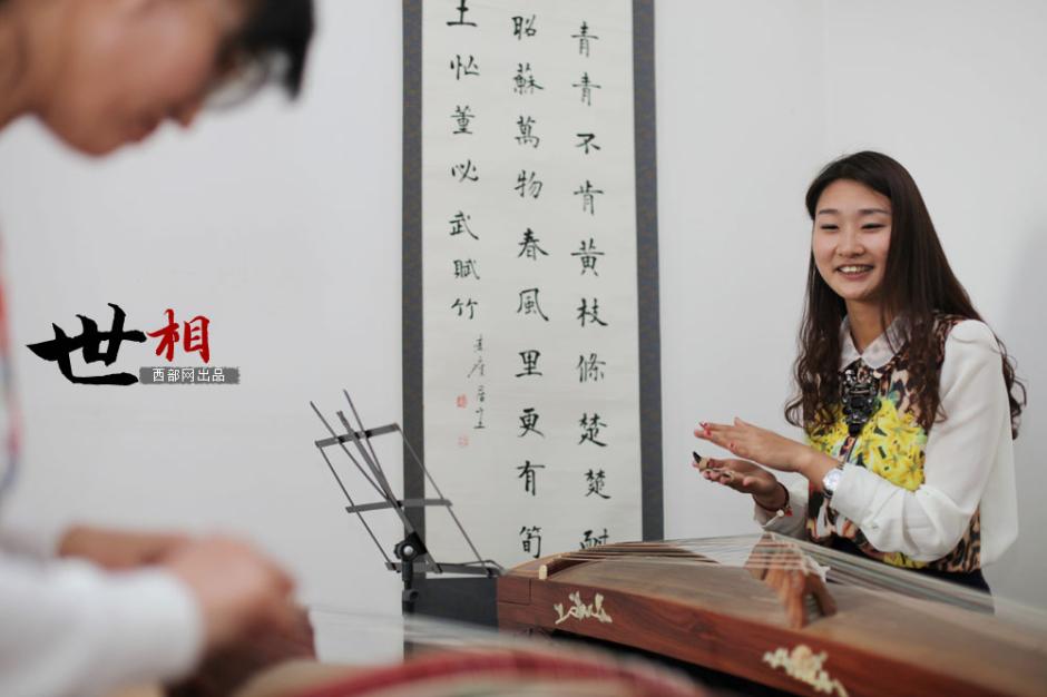Zhang Wenjin teaches a student to play guzheng in her music training center. (cnwest.com/Wei Yongxian)